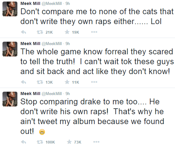 Reference tracks from Drake’s, “If You’re Reading This It’s Too Late” surfaced to provide some background for the claims Meek made. Hot 97’s DJ Funkmaster Flex played Quentin Miller’s version of “10 Bands”, which led to further ghostwriting speculation.