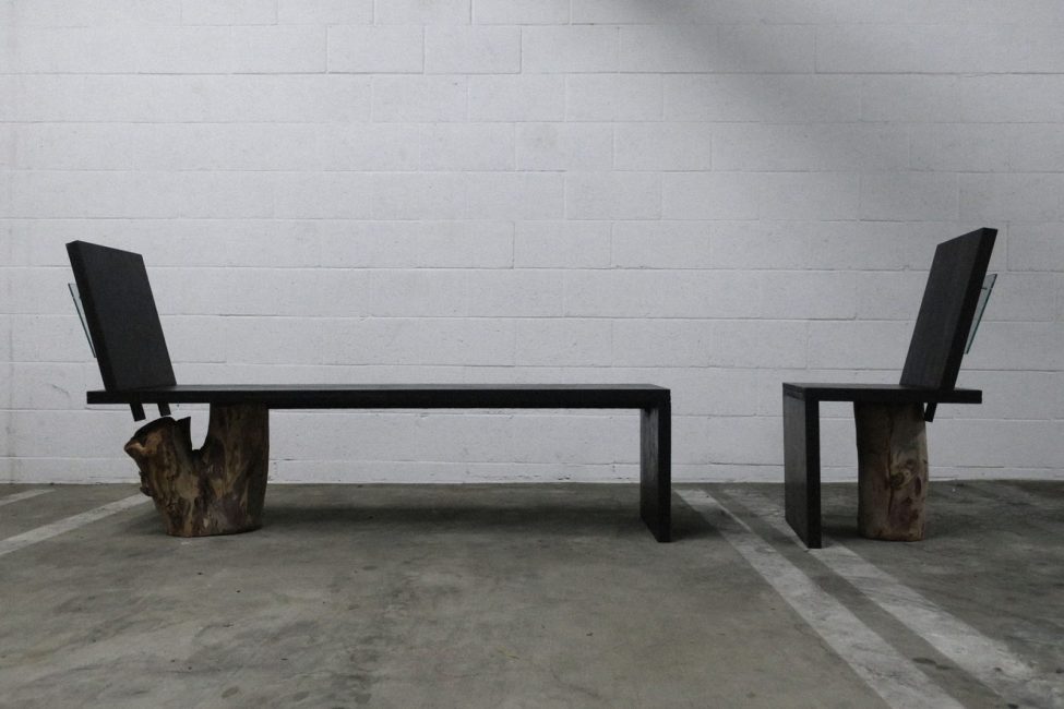At the crossroads of design and function, Helder Vices established a minimalist nature-inspired furniture line. The offering inextricably links the contemporary concept of “PIMA” furniture with the rawness of nature. Its’ dark black tone symbolizes futurism, simplicity and authenticity. The set of furnishings involves an interchangeable backrest bench and chair comprised of glass, eucalyptus and oak ply.