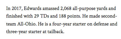 Truly a difference maker, Edwards Jr. has what it takes to score six every time he gets the chance. He leaves defenders in the dust with quick stop and start movements, shifty quickness and sharp jump cuts. When asked about what elements of his game give him an edge up on the competition he replied,