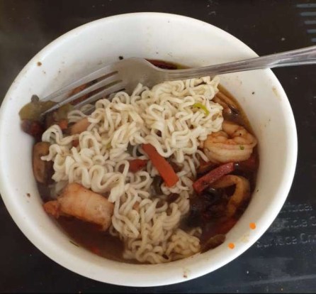 4) Once your ingredients are nearly finished cooking put 2 cups of water into a bowl and heat up ramen in two 90 second increments and stir/break up noodles every 60 seconds.