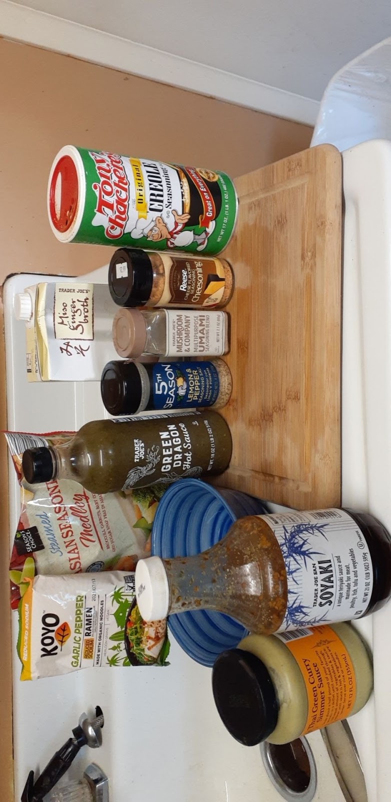 - Season with your array of any spice depending upon flavor, preference or availability. I chose lemon pepper, umami mushroom, cheesoning and Creole to sprinkle upon the first items placed upon the chopping board.