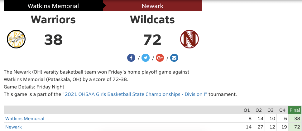 Newark Wildcats defeated the Watkins Warriors 72-38 and Maddie Vejsicky set the all-time 3 point school record with 10 3 pointers to notch a total of 36 points. Emma Shumate had 6 blocks* in the contest and Newark shot 50% from 3 on 17-34 shooting.